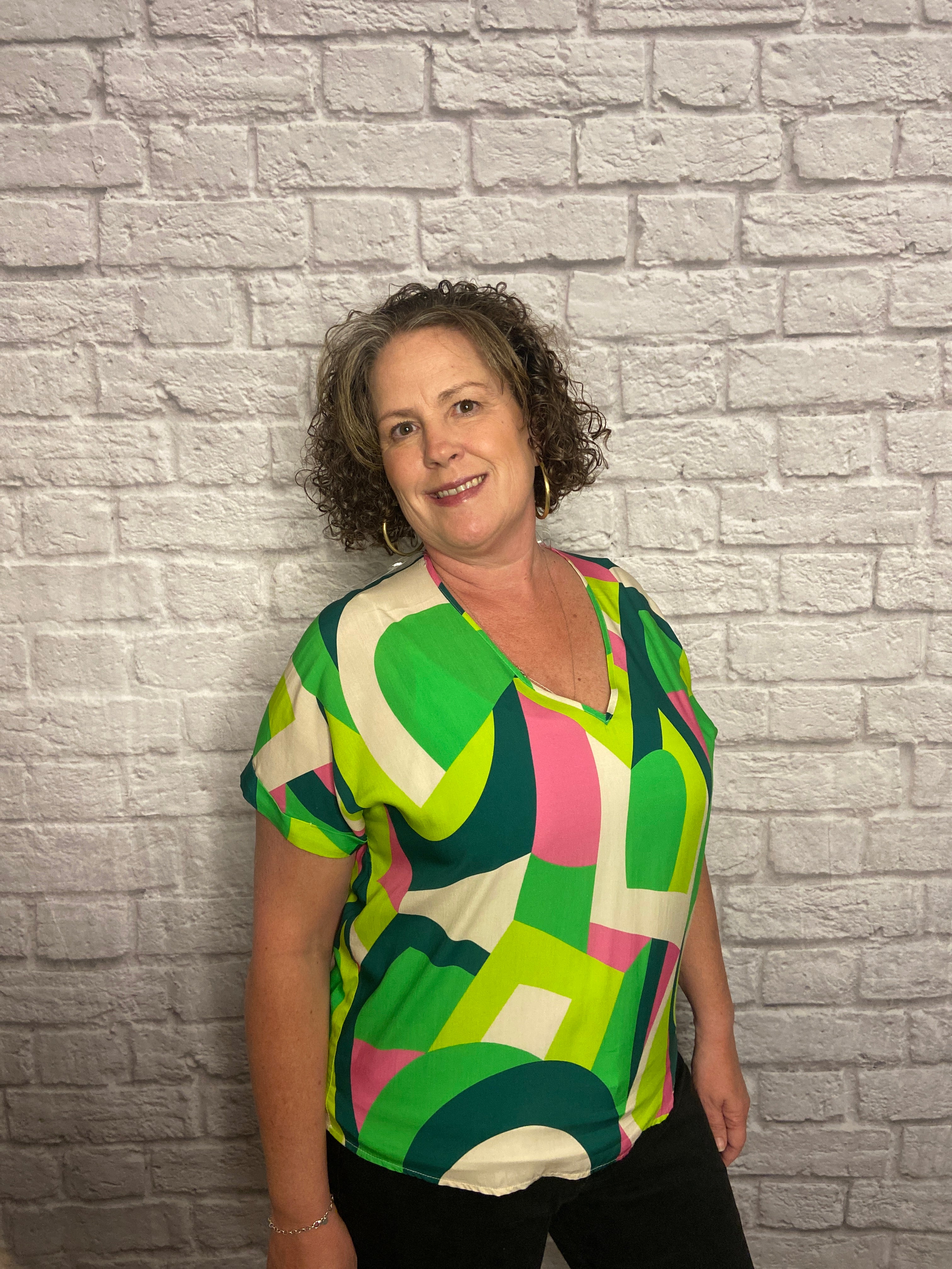 V Neck Short Sleeve Multi Geo Print